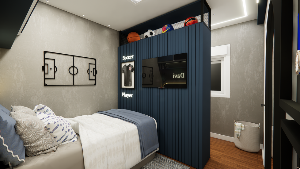De um lado, a área de descanso com iluminação acolhedora e elementos que celebram o amor pelo futebol. Do outro, um cantinho gamer com direito a letreiros neon e personagens!